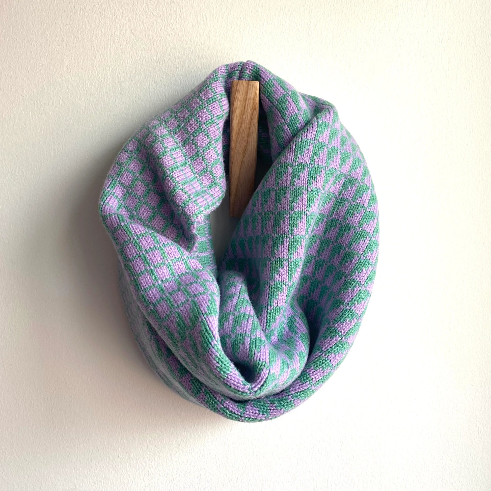 This graphic snood by Carolyn Sara Designs begins as a thread of luxury lambswool that is knit row by row using a hand powered knitting machine. The snoods are designed and handmade in her Manchester studio using high quality merino lambswool spun and dyed in West Yorkshire. Sara's Persian heritage has influenced her love for colour and pattern, which is reflected in her daring colour combinations and graphic, geometric designs.