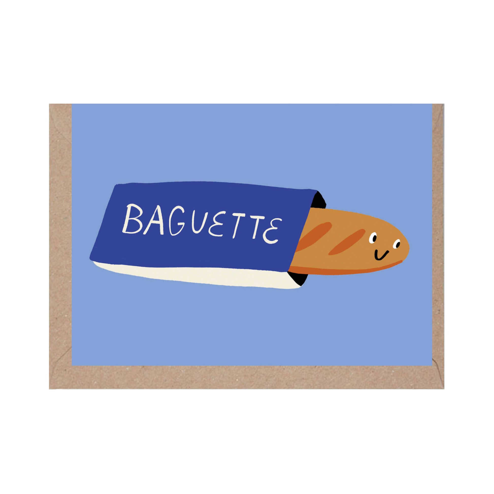 A playful mini greetings card from Glitter Power Club, a Paris-based designer known for bold colours, charming characters and joyful everyday motifs. This design features a smiling baguette wrapped in paper, a simple and fun illustration that celebrates French culture with humour and warmth.