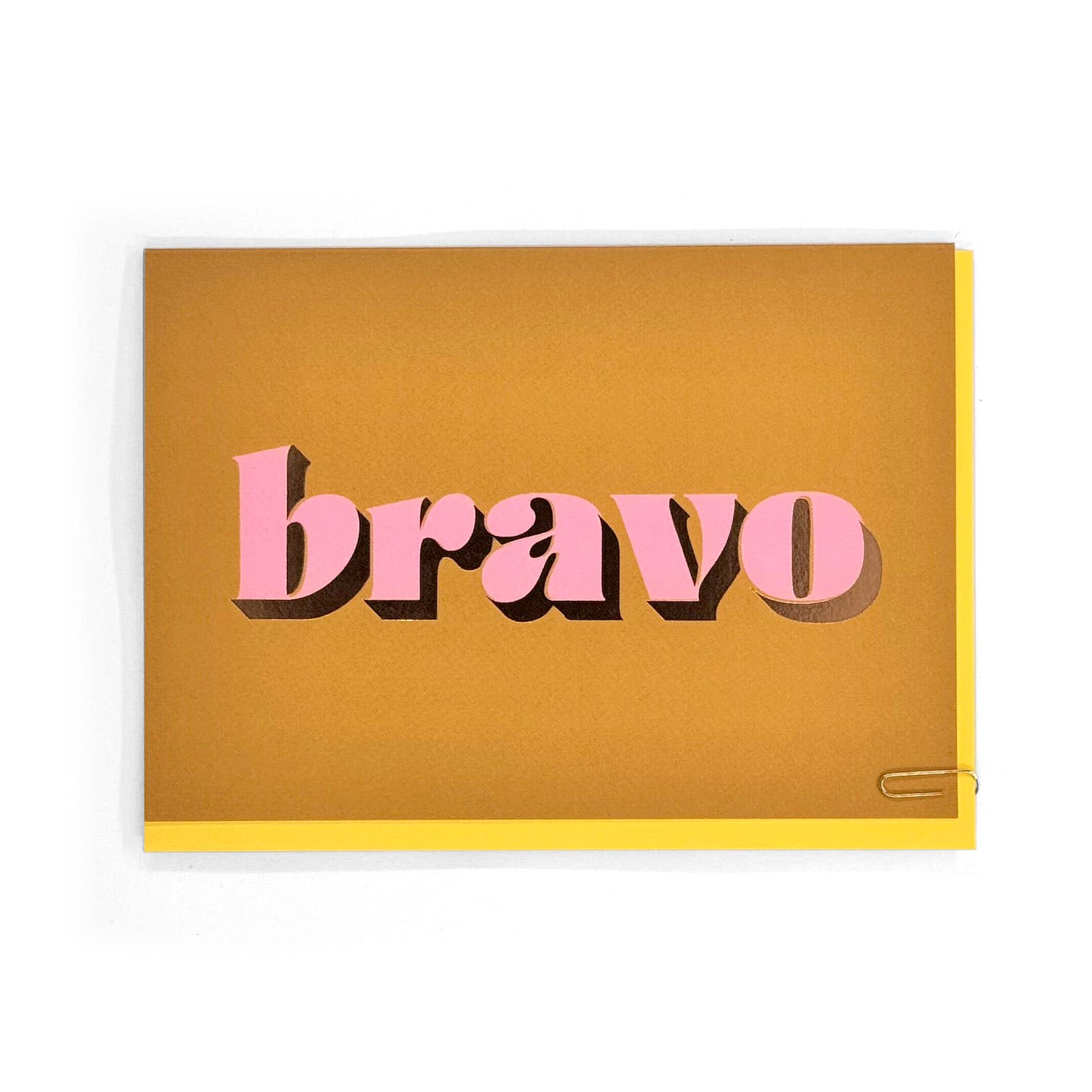 A bold and graphic card with 'bravo' in gold foiled lettering, perfect for sending congratulations on a new job, new baby or graduation.