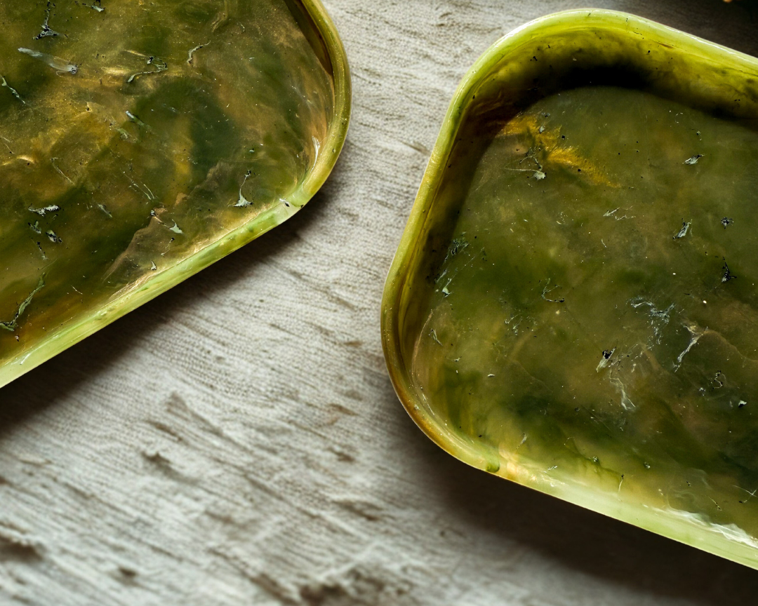 The Shimmer Limited Edition Recycled Plastic Tray is hand crafted in Margate from 100% recycled plastic waste collected from across the UK. The Shimmer Tray blend was created using a deep green plastic from Belazu food containers along with a variety of golds including Kendamil baby food lids, making each tray truly one-of-a-kind.