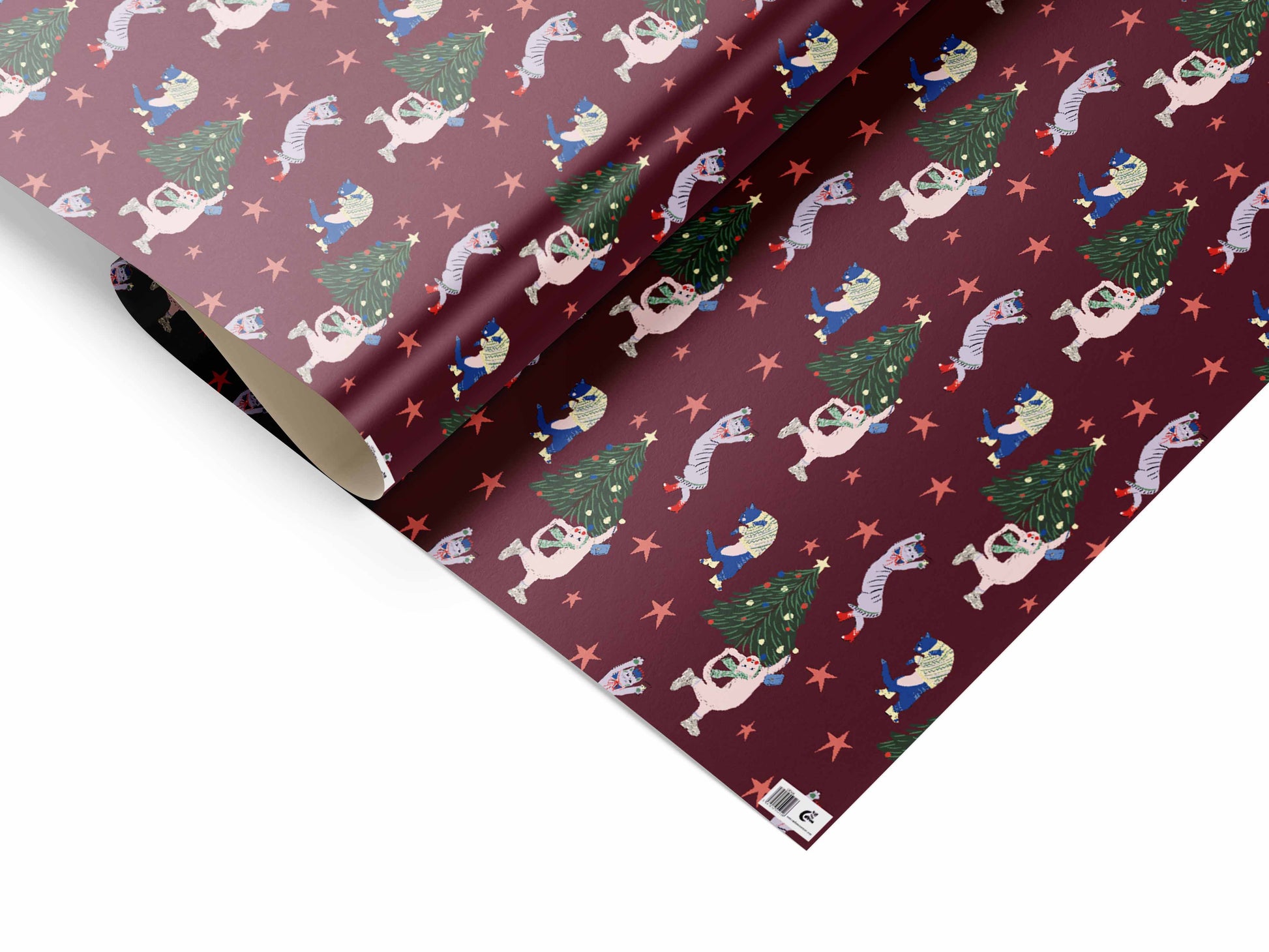 A high quality, large gift wrap sheet with a colourful design featuring festive cats rocking around the Christmas tree.