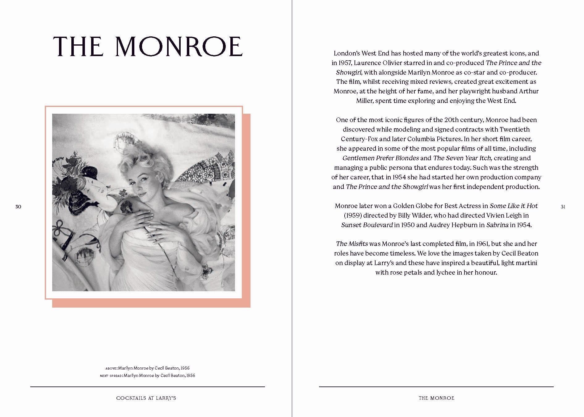 From the regal gin cocktail ‘The Cecil Beaton’ to the experimental, colourful ‘CMYK Fizz’ inspired by Yevonde, and the award-winning dirty martini McBean cocktail, these fabulous drinks evoke bygone eras and the spirit of London’s West End. Following an introduction to Larry’s Bar and its namesake, Laurence Olivier, the book showcases bespoke cocktails, telling the stories behind their inspiration, ingredients and design. Each story is illustrated with images of each drink and portraits of iconic figures from the National Portrait Gallery.