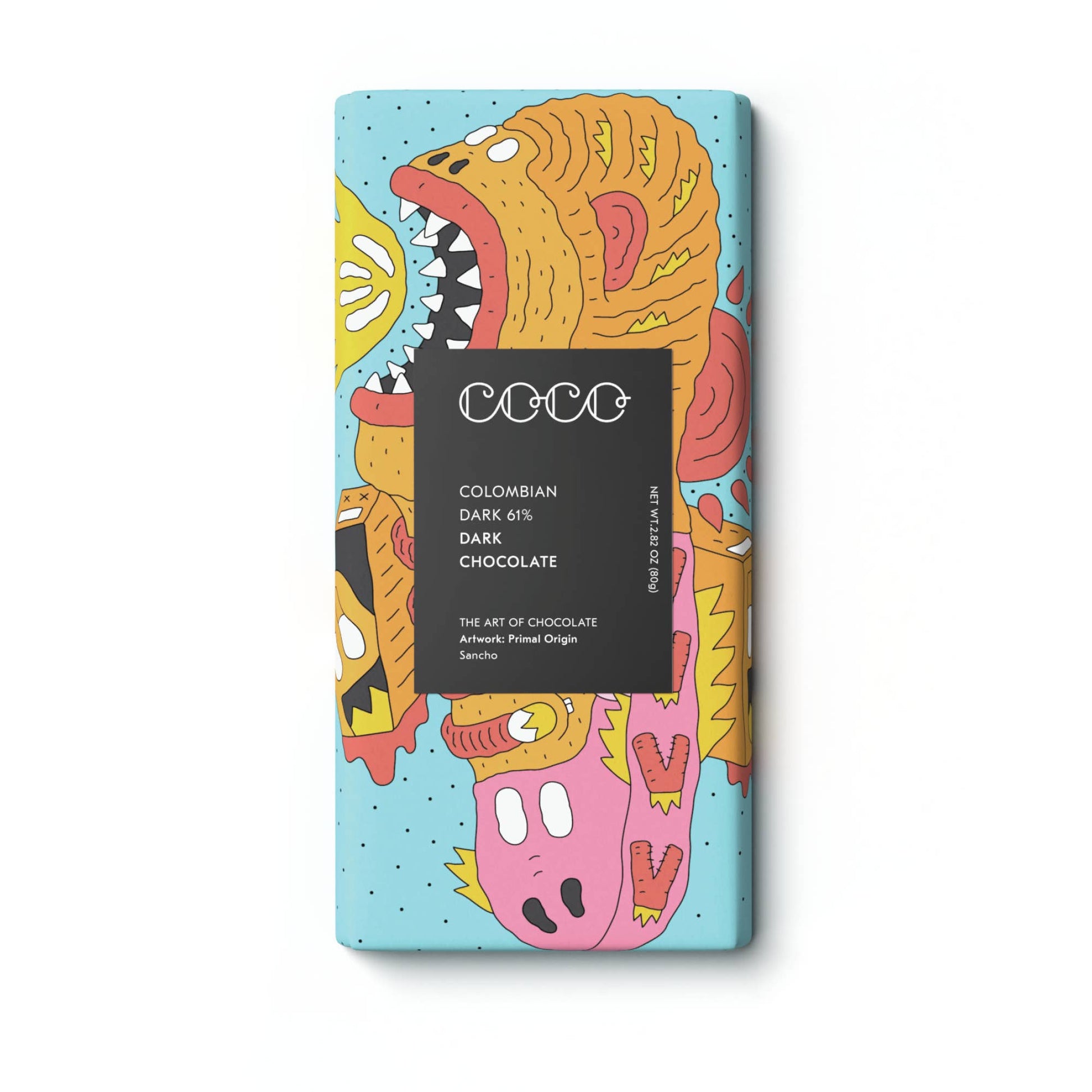 A chocolate bar with the indulgent flavour of citric fruits and spices with herbal notes and light acid tones that gives a good balance between sweet notes and typical chocolate flavours. A mild, creamy, and delicate texture. Wrapper design by Dutch artist Sancho.