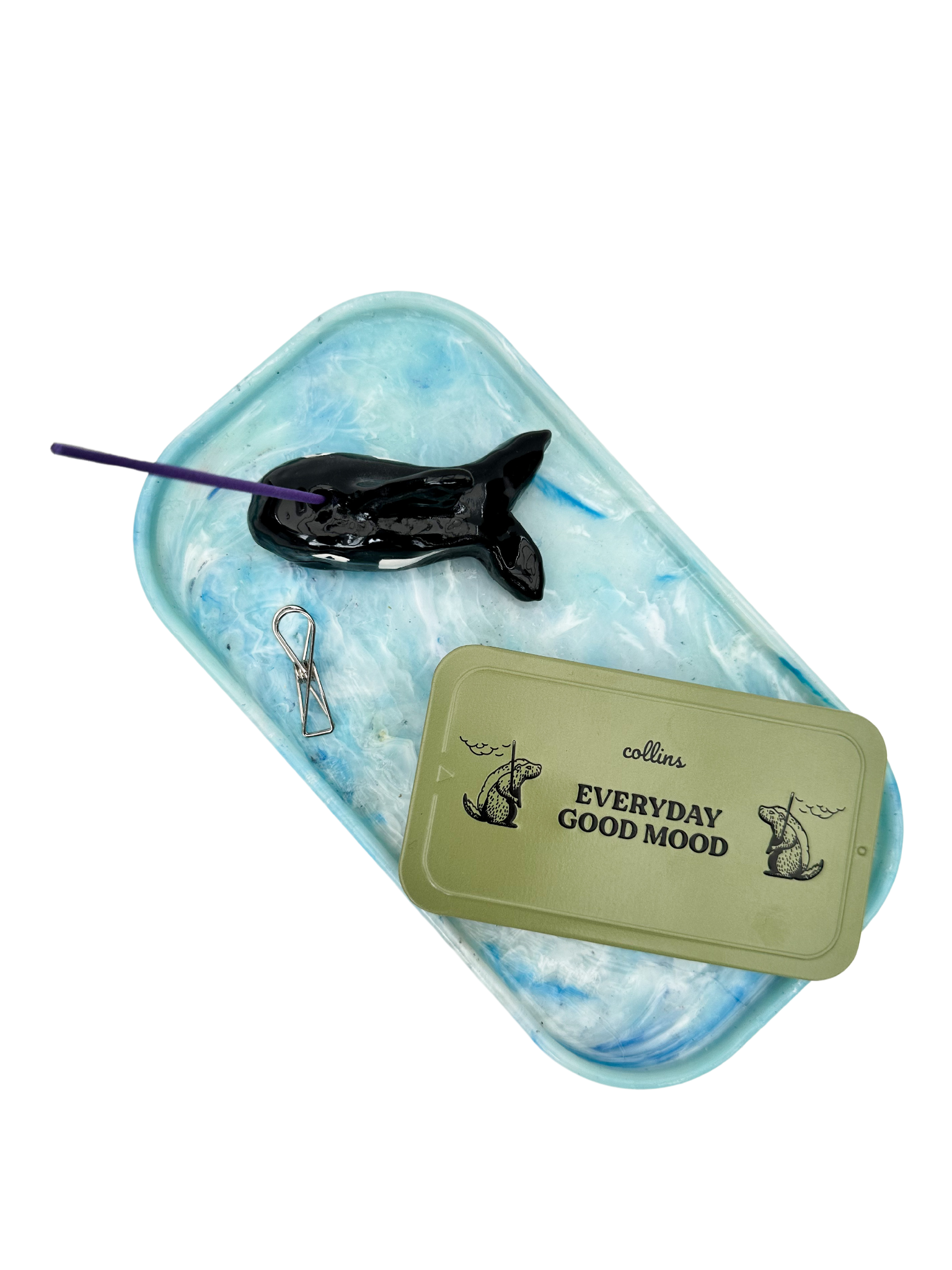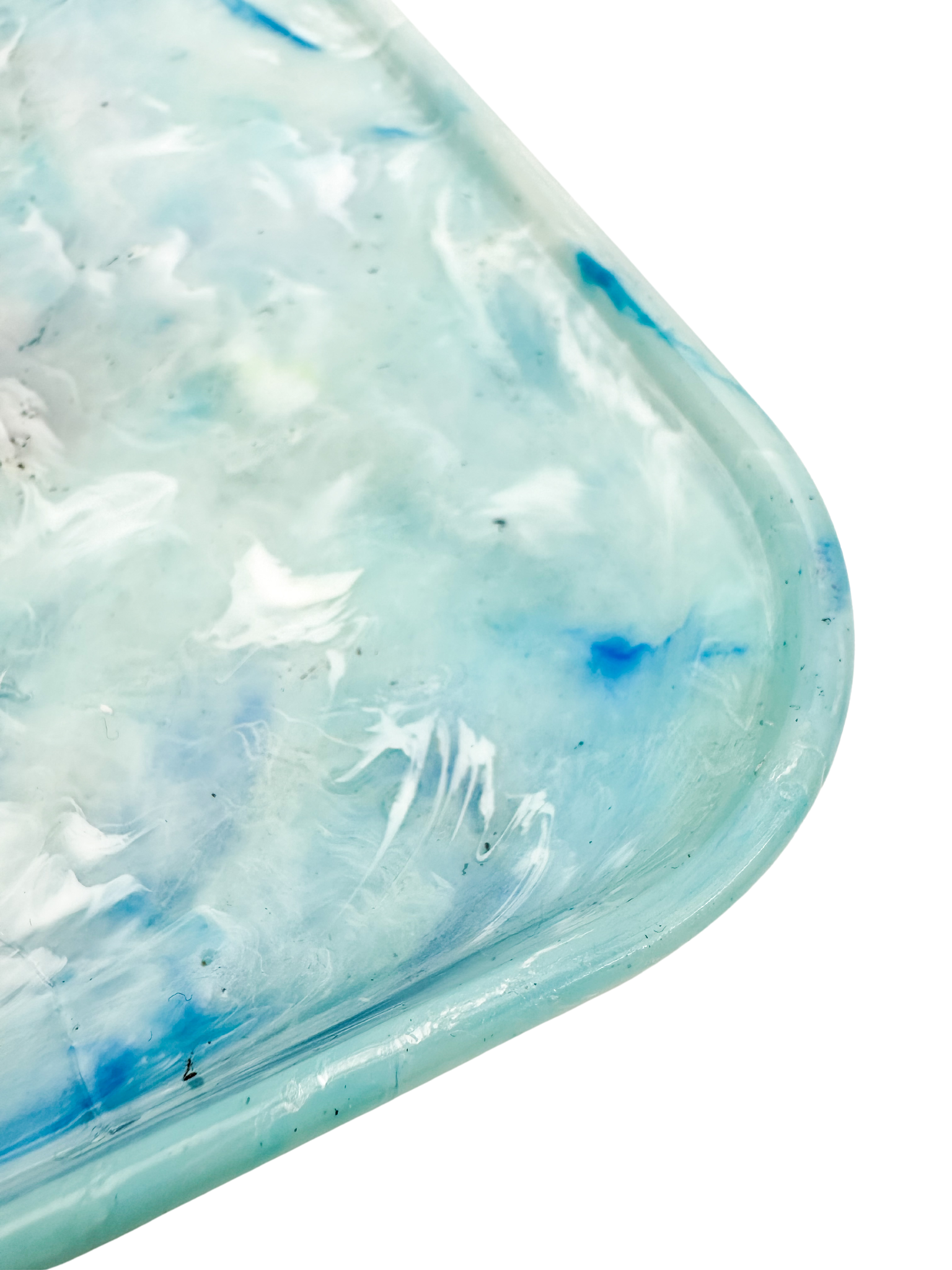 The Greek Recycled Plastic Tray is hand crafted in Margate from 100% recycled plastic waste collected from across the UK. The Greek Tray features a unique marbling pattern in a blue and white colourway, made predominantly from Fage and other Greek yogurt pots, double cream pots and baby food lids, making each tray truly one-of-a-kind.