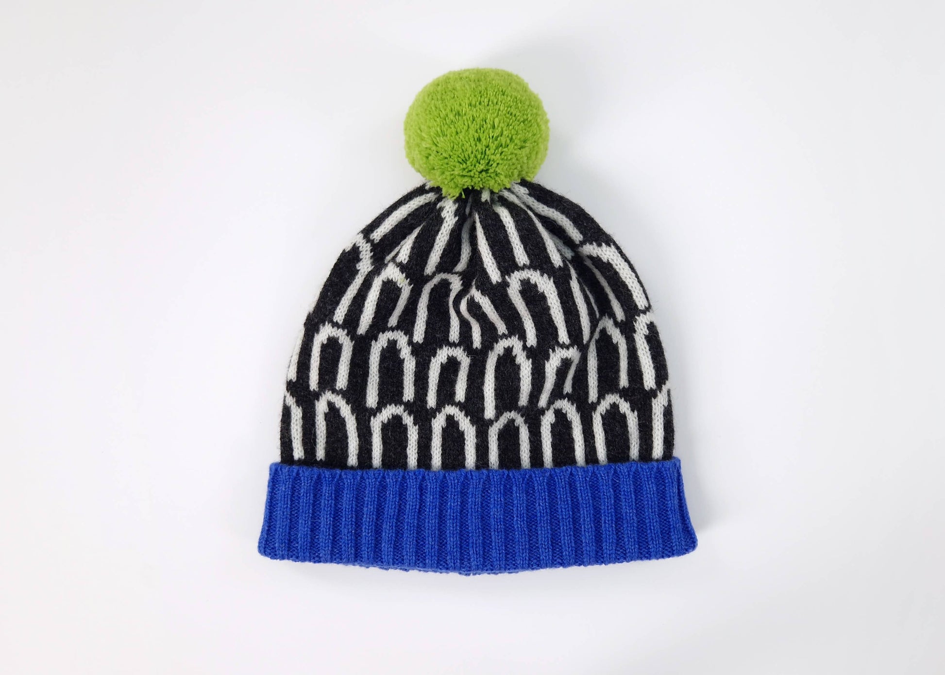 This super cosy 100% lambswool pom pom hat features a two-tone arch pattern in charcoal and ecru, finished with a contrasting ribbed cuff in Tahiti blue and a lime green pom pom.
