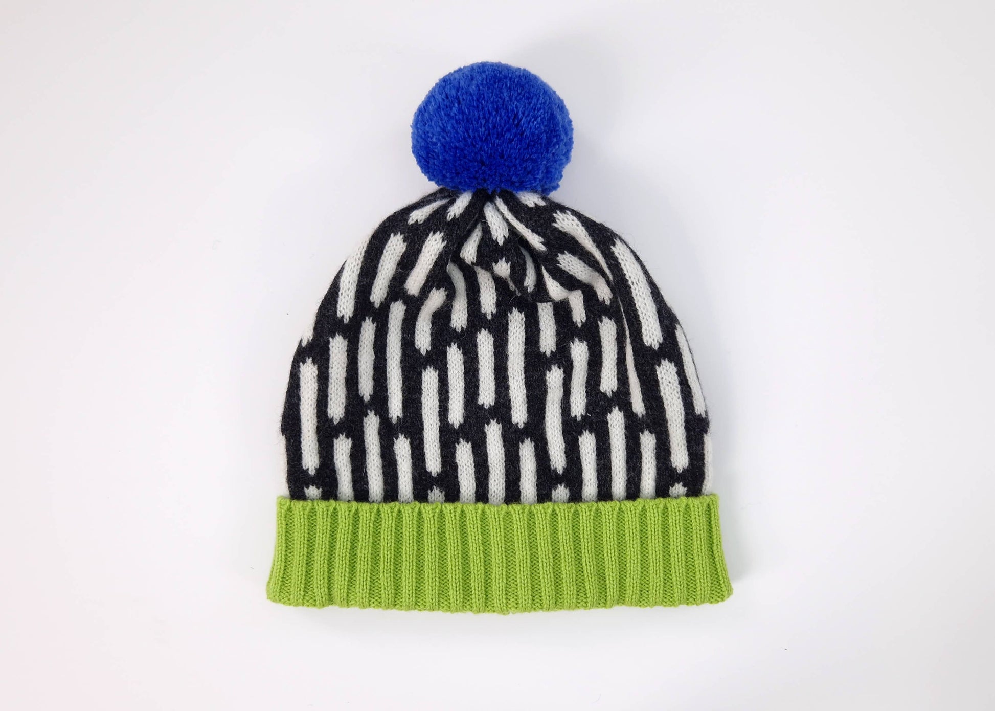 This super cosy 100% lambswool pom pom hat features a two-tone dash pattern in charcoal and ecru, finished with a contrasting ribbed cuff in lime green and a Tahiti blue pom pom.