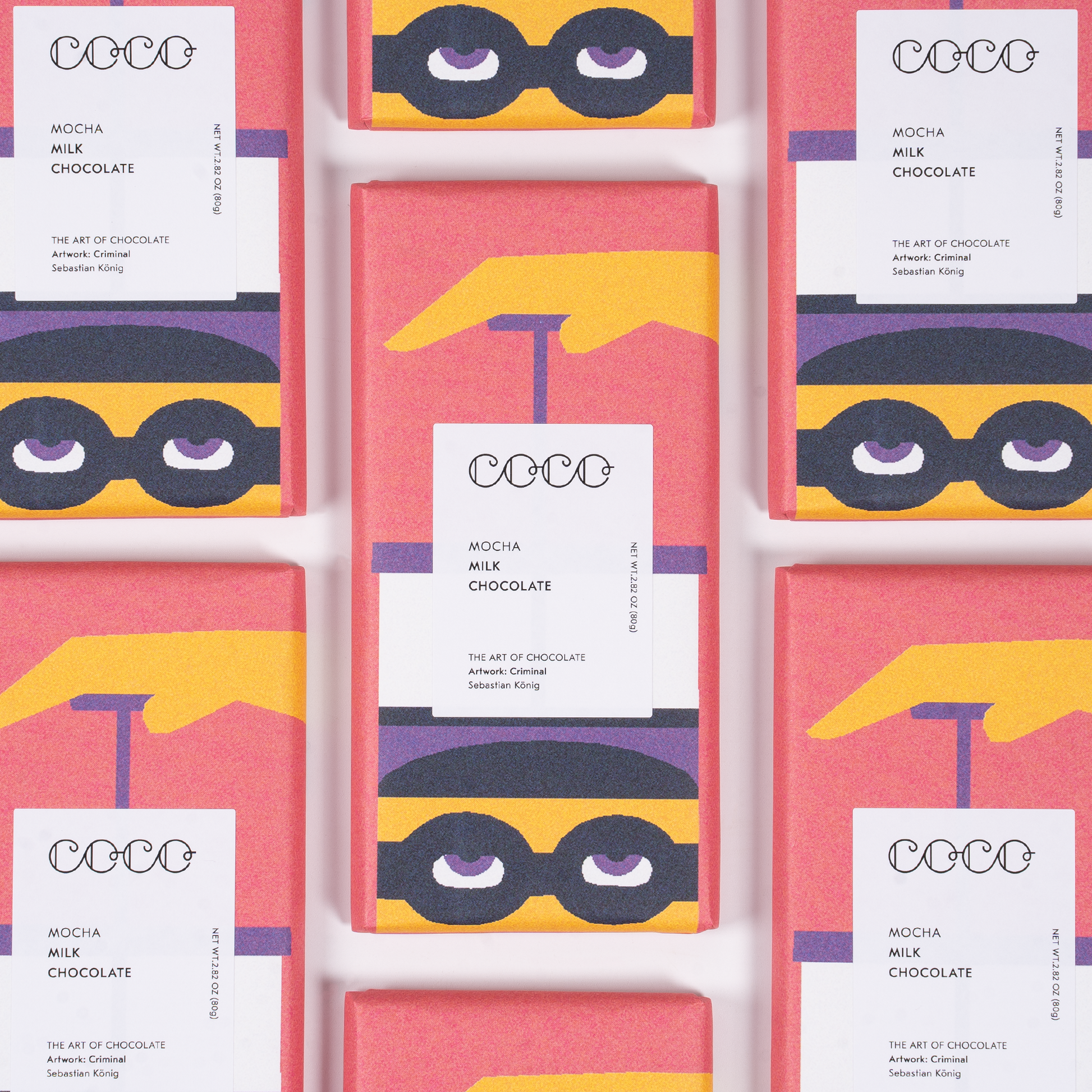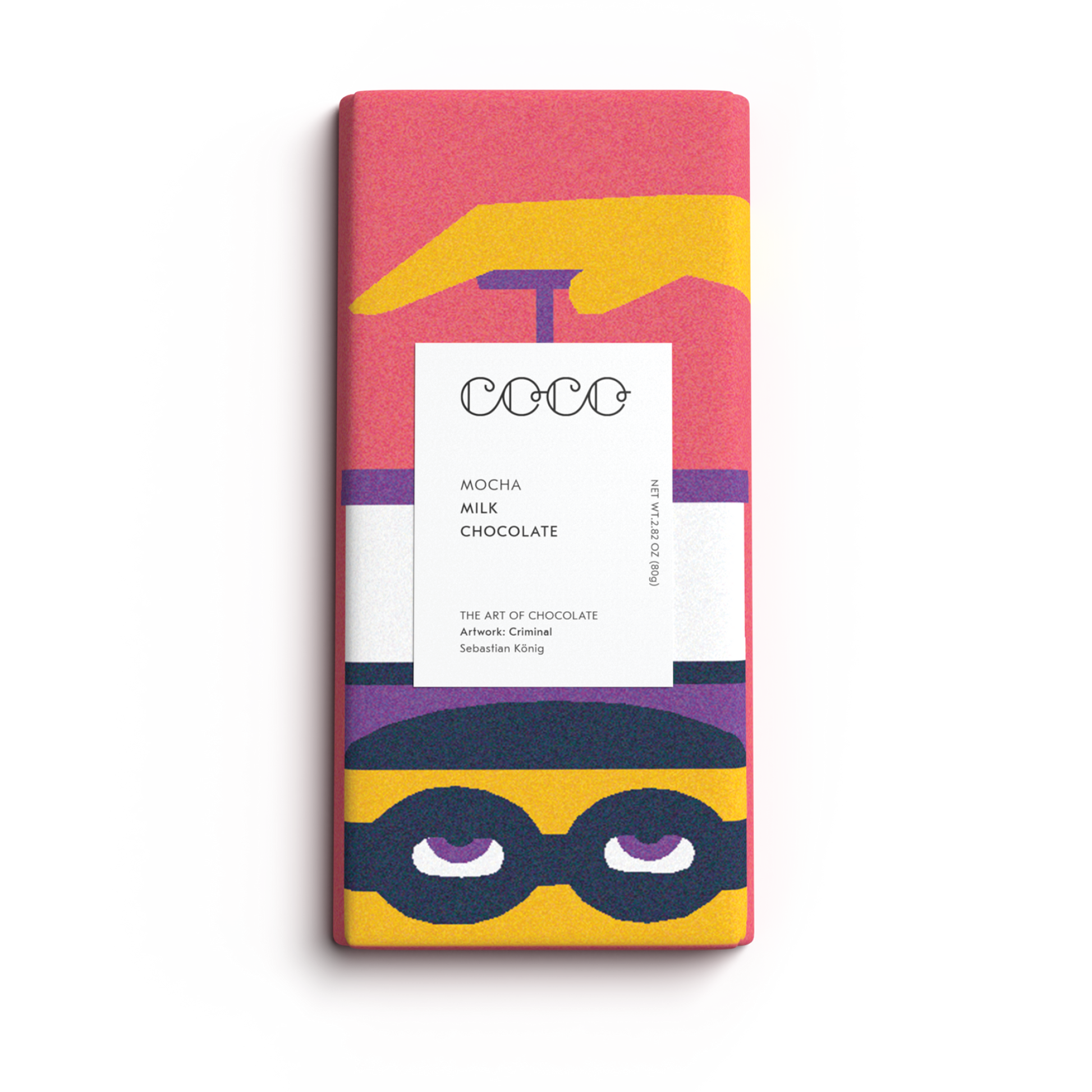 This milky chocolate bar has 40% cacao content made with fine flavour cocoa beans from Colombia. It delivers a good balance between sweetness and well-defined cocoa flavours, with exquisite notes of roasted coffee and delicate hints resembling hazelnuts, finishing with a sweet and creamy aftertaste. Wrapper design by German artist Sebastian König.