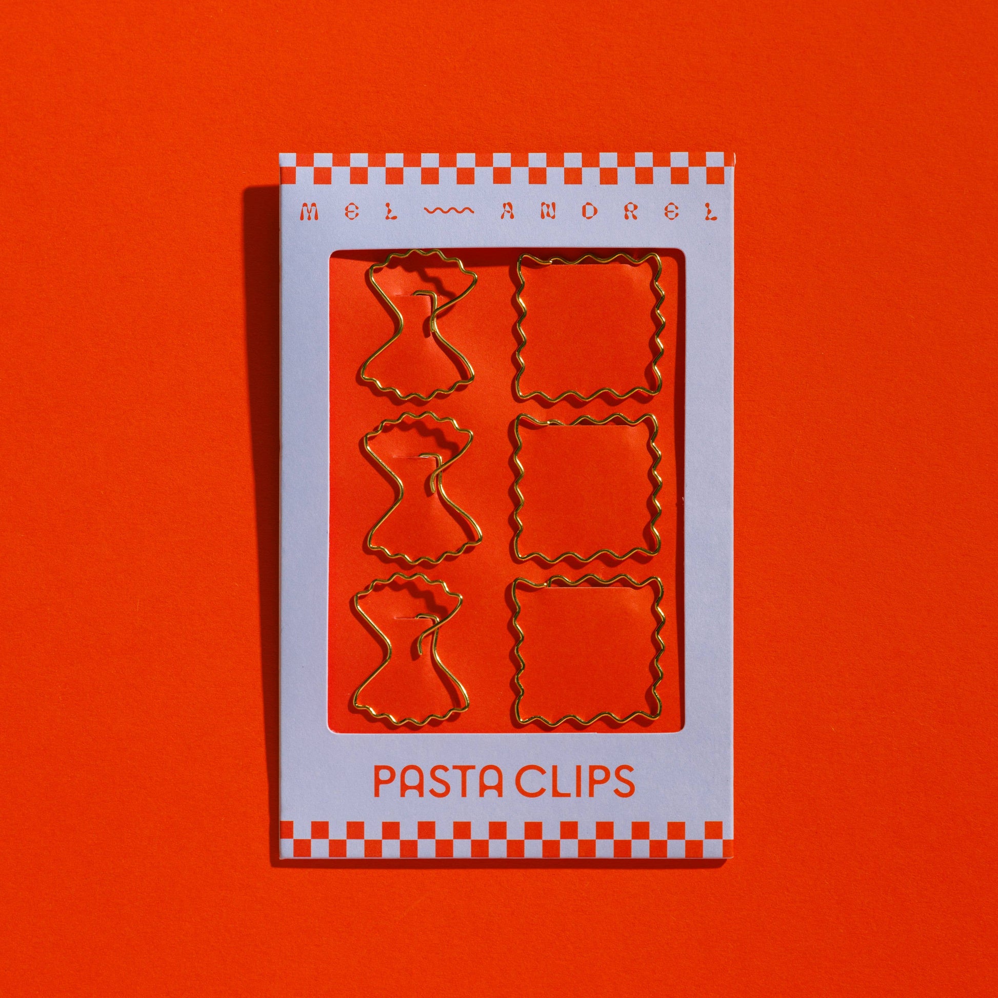 This set of 6 unique and versatile pasta-shaped gold metal clips can be used as paperclips, page holders, or bookmarks. Secure your top-secret documents, bookmark your essentials, and use them for as long as you'd like! Each pack of 6 includes 3 farfalle and 3 ravioli clips and comes in recycled paper packaging.