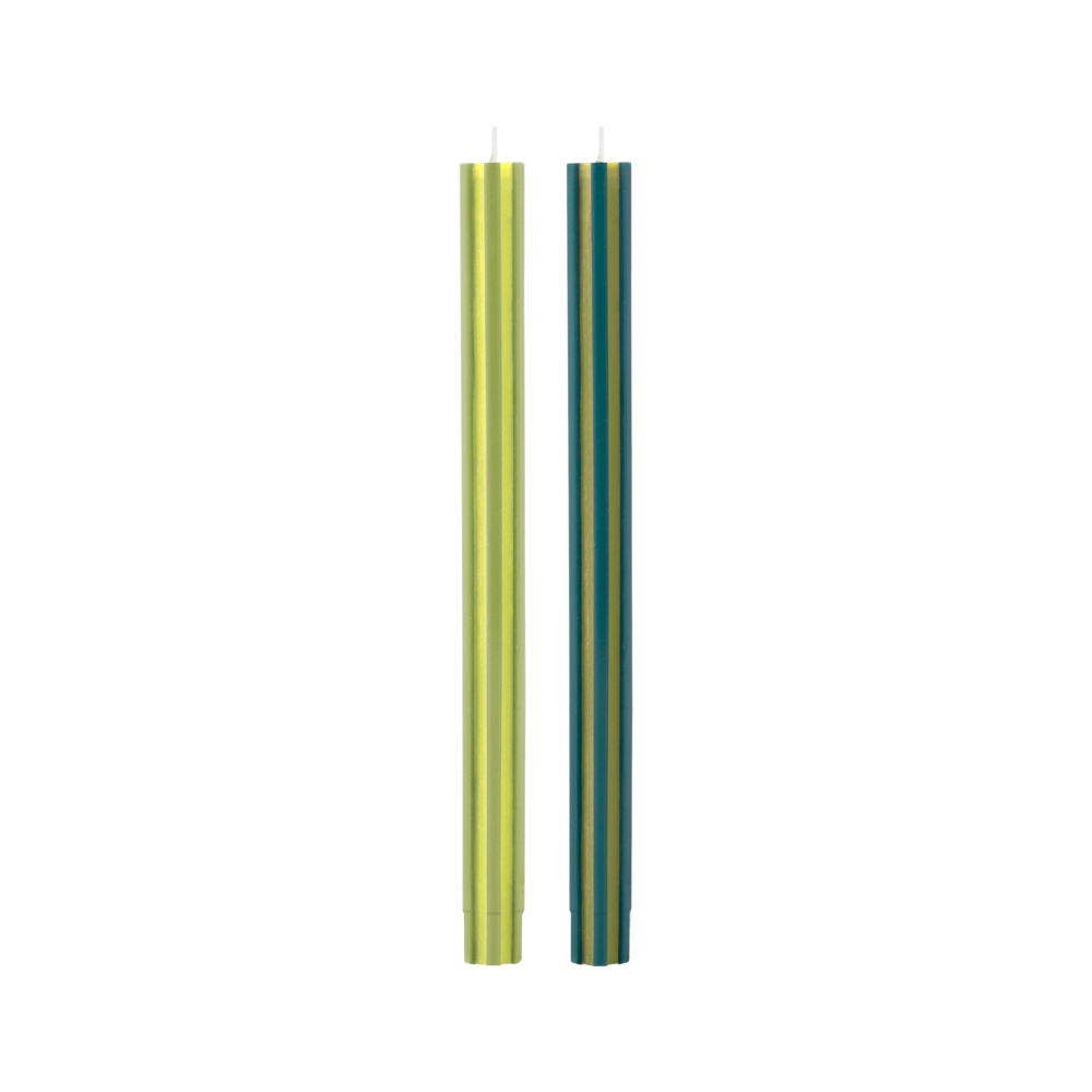 These colourful, ribbed dinner candles are hand-poured in vibrant contrasting shades. Made from vegan stearin wax and coloured with ecological dyes, they not only have a fun design but also a long burning time. As these candles are handmade, slight variations in shape and colour may occur. These characteristics have no effect on the burning behaviour of the candle.