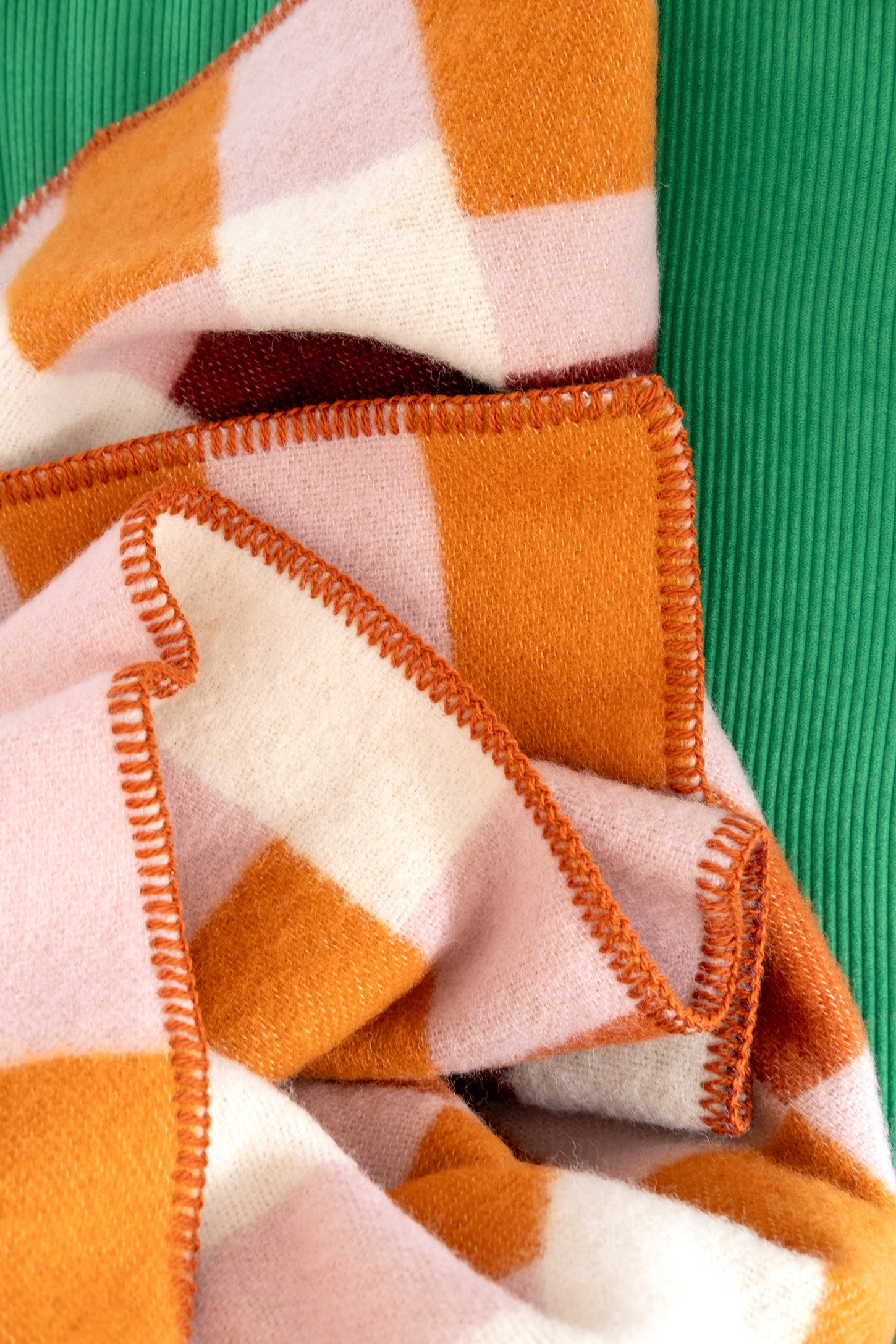 This beautiful blanket features a striking geometric design and is woven in premium New Zealand wool, giving it a substantial, thick and warm handle. The pink, orange, burnt orange, burgundy and ivory design brings a joyous hit of colour into your space.
