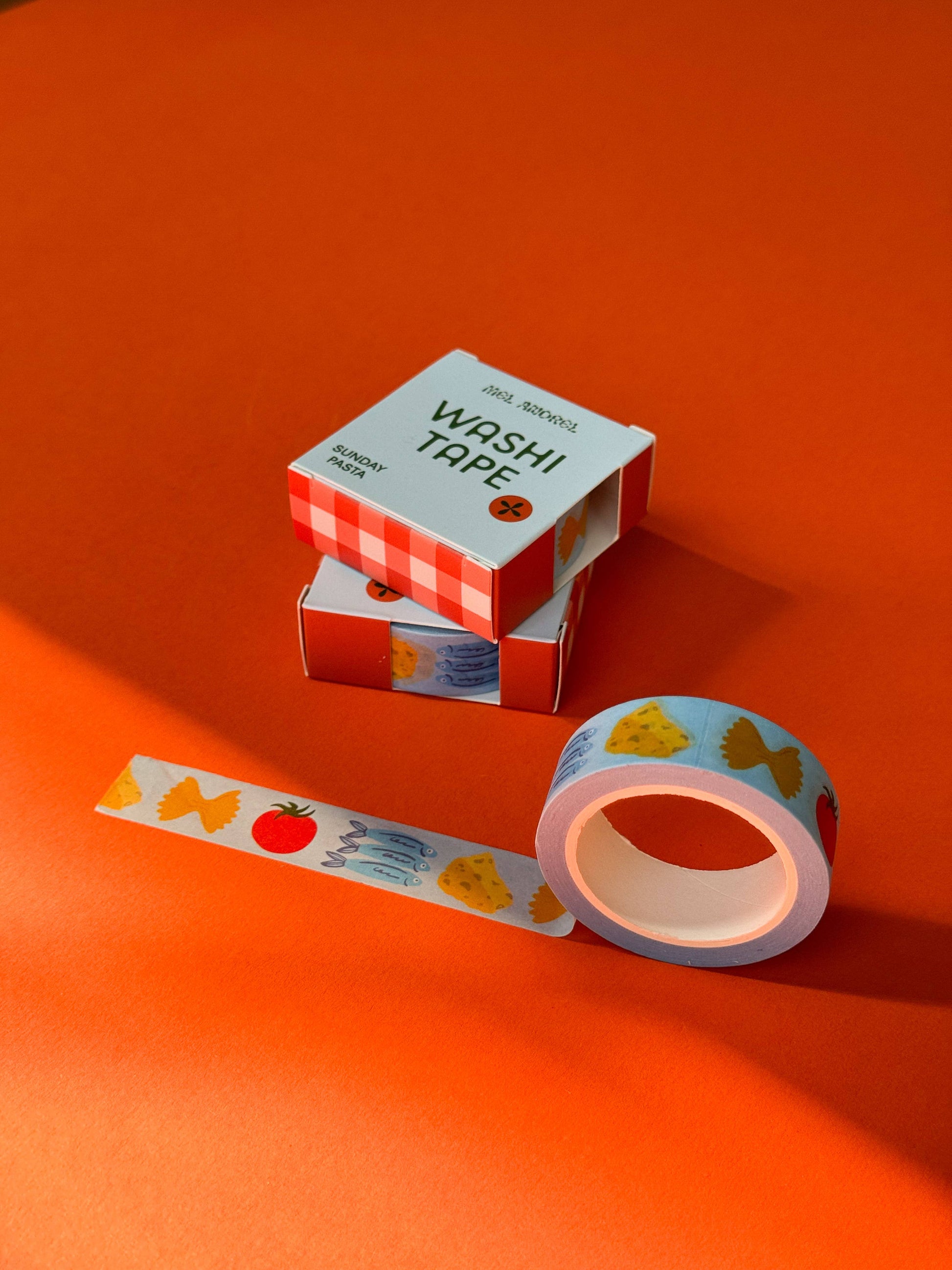 Wrap up your thank yous or craft your gratitude journals in style with this delightful roll of washi tape. The tape features a 'Sunday Pasta' pattern design with illustrated fishes, farfalle, tomatoes and cheeses, all the ingredients for the perfect Sunday Sauce, Caesar Salad, or Coastal Mediterranean Feast.