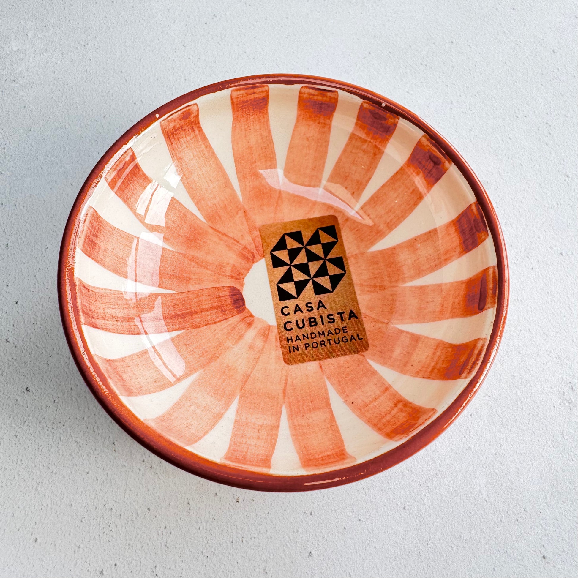 The perfect little bowl for snacks, olives or nibbles. Hand painted with a graphic terracotta sunray pattern over a white glazed base.