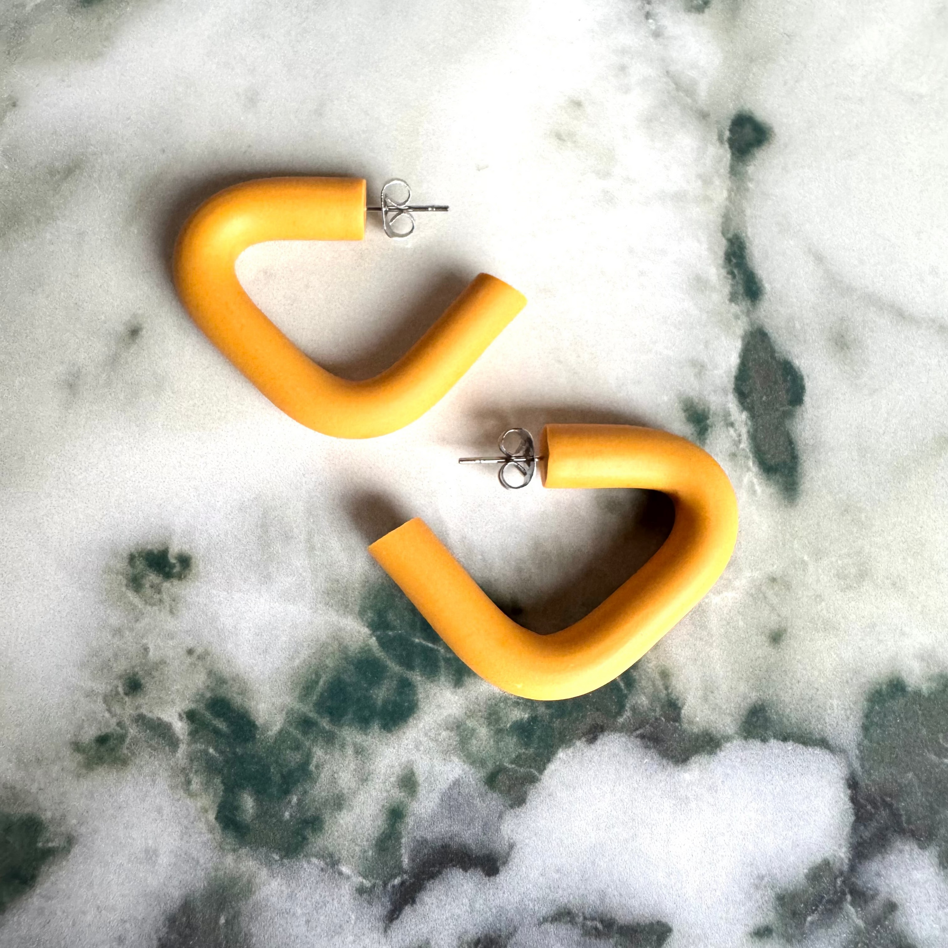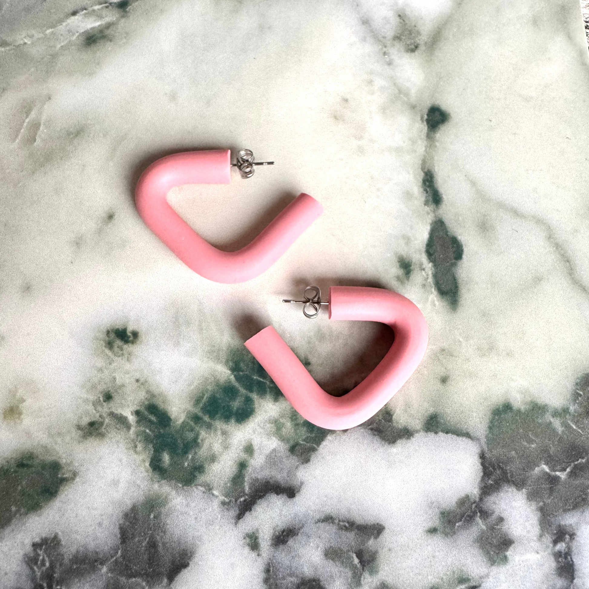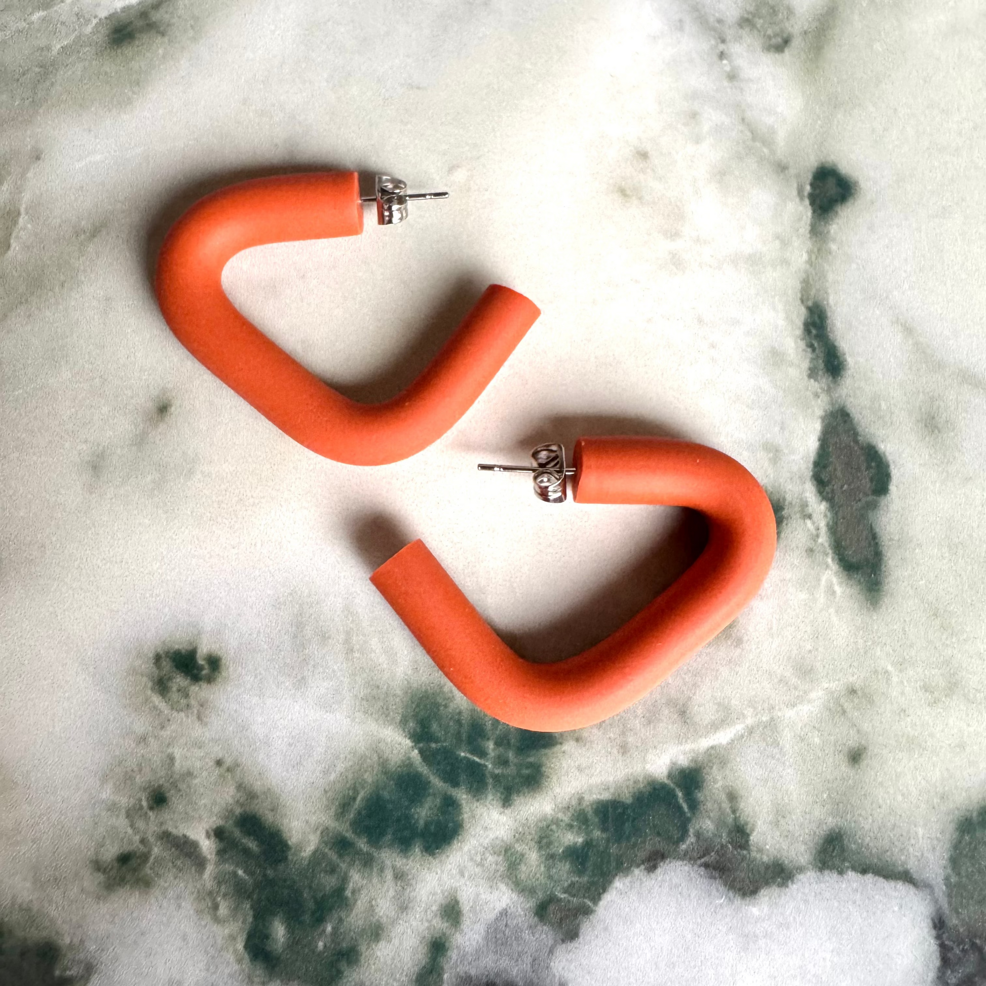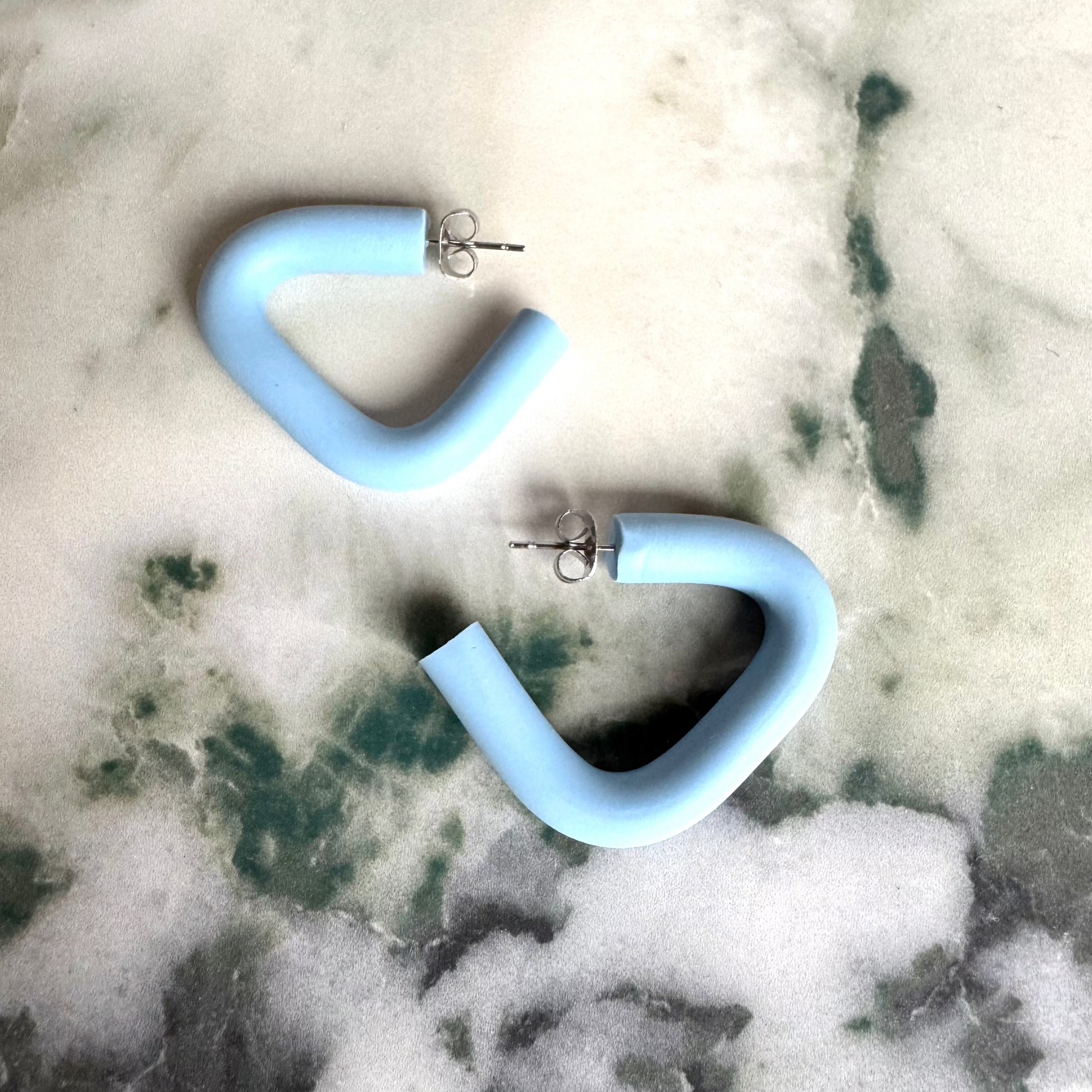 Super fun, versatile and colourful triangle-shaped clay hoops for those days when you want to effortlessly spice up a basic outfit. Polymer clay is a super lightweight material which means even very big earrings don‘t weigh down the ear too much, perfect for wearing all day and night without achy ear lobes.